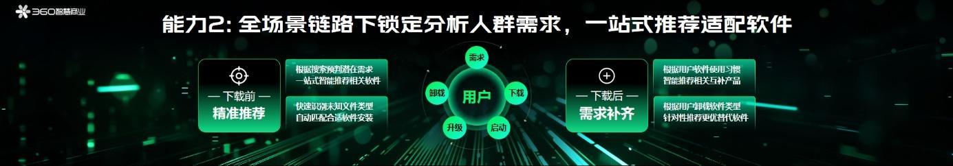 围绕用户软件需求、下载、启动、升级、卸载,全新360软件管家实现了全场景链路下的功能升级,通过锁定目标人群在下载前后的不同场景,做到下载前软件精准推送和下载后的需求补齐,一站式匹配软件功能和用户需求。在为用户高效提供解决方案的同时,也为产品打造高效触达用户的通路。