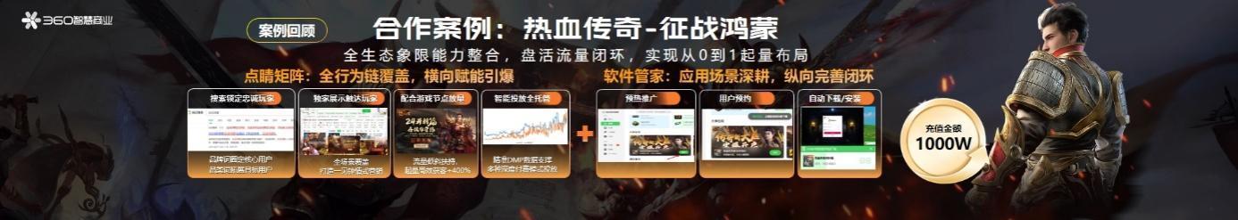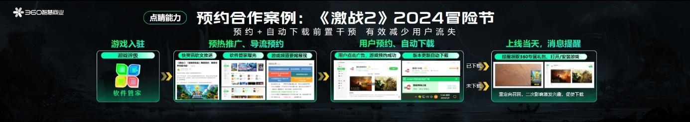 以游戏行业为例 ,新软管上线“游戏预约”功能,深挖游戏应用场景,全链路覆盖核心游戏用户需求。通过打通用户预约、自动下载、游戏安装的路径闭环,有效减少用户流失。在游戏的预热、上线、版本升级等关键节点上,360全媒体资源叠加,全网分发、精准触达,高效提醒,强势导流预约。