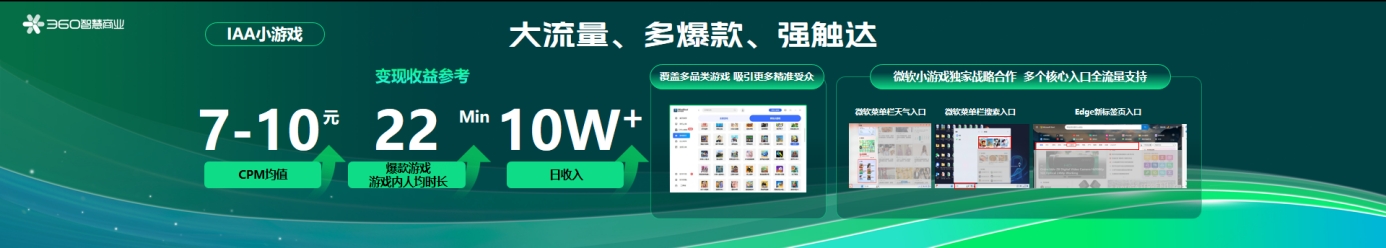除软件管家之外,360也将整合旗下全矩阵产品助力联盟合作伙伴流量变现——360墨鱼丸深挖PC短视频价值洼地,助力获取PC端全新增量;明星级展示广告产品360PC锁屏画报强势助力,以PC端第一媒体之力击穿办公场景,触达亿万上班族,高净值人群精准覆盖,有效提升转化;IAA小游戏平台开放多个核心流量入口,全面赋能小游戏开发者和流量主双端实现价值共赢。