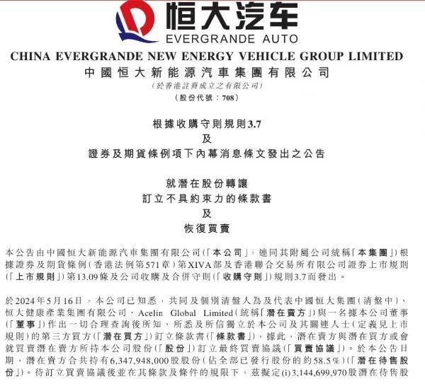 复牌前一晚(5月26日),恒大汽车发布公告称,公司约31.45亿股潜在待售股份(占全部已发行股份的约29%)将被收购。