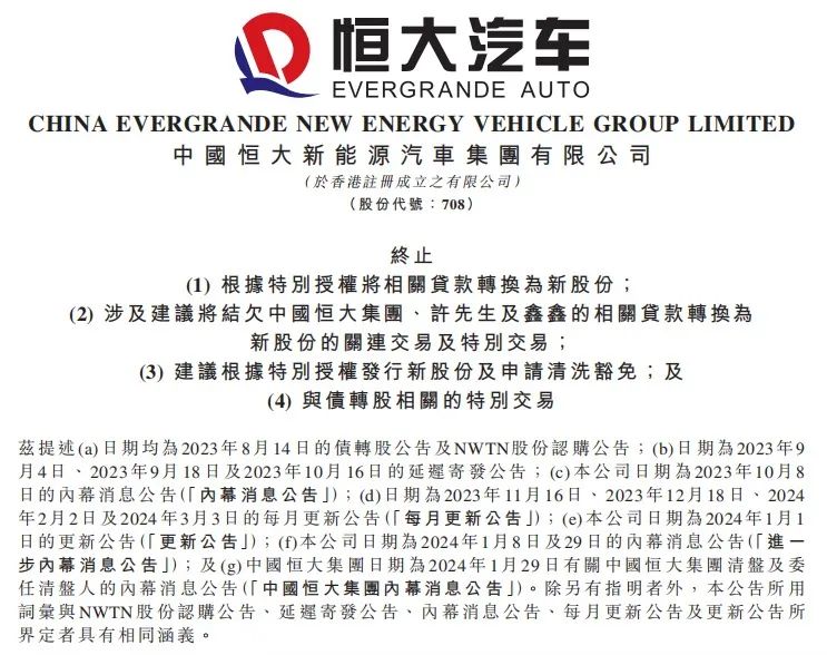 在外界看来,纽顿集团的这笔资金对于连续多年亏损的恒大汽车是“救命钱”。然而,2023年10月8日晚间,恒大汽车发布公告称,因中国恒大发生的变化,战略投资方纽顿集团暂停对公司的过渡期资金支持,并针对拟议交易方案所需的调整进行重新谈判。今年4月5日,恒大汽车与纽顿集团签订的战略投资协议正式宣告终止。