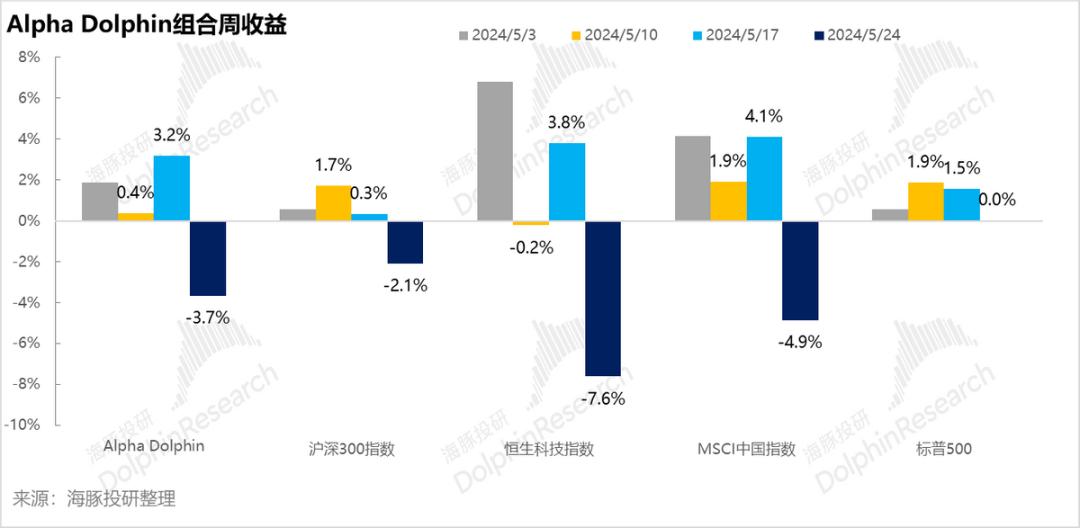 上周结束,组合收益回撤3.7%,跑输了基本未动的标普500,以及沪深300(-2.1%),但跑赢了恒生科技指数(-7.6%),以及MSCI中国指数(-4.9%)。