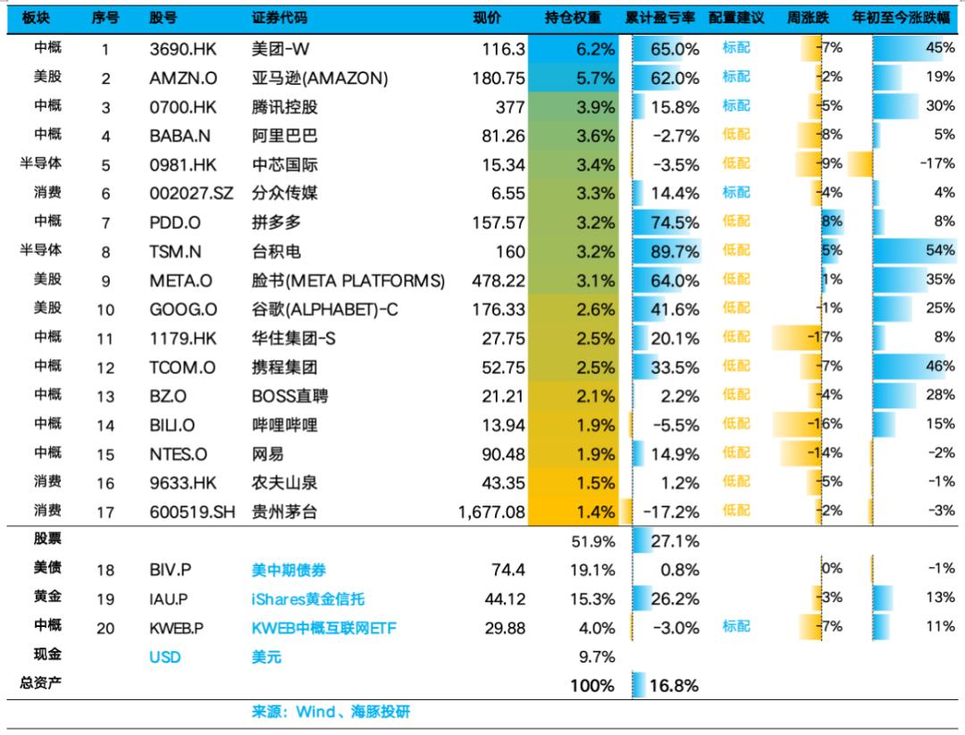 Alpha Dolphin虚拟组合调出理想和贝壳之后,共计持仓20只个股与权益型ETF,其中标配5只,其余权益资产为低配,剩余为黄金和美债和美元现金。目前现金与类现金资产剩余较多,接下来几周仍会加仓权益资产。