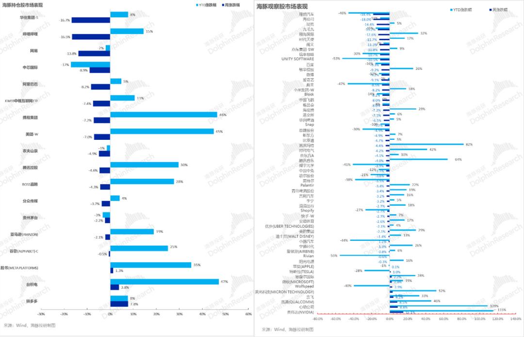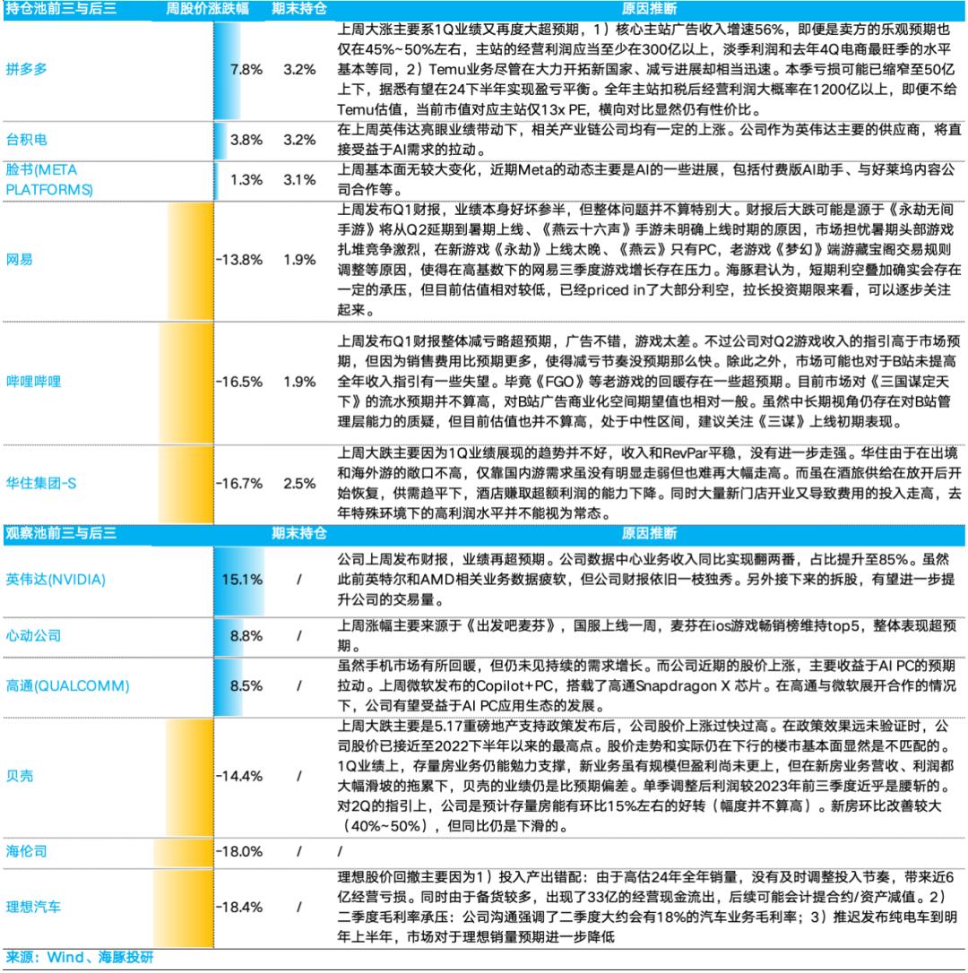 对于海豚君持仓池和关注池中,上周主要涨、跌幅比较大的公司以及可能原因,海豚君分析如下: