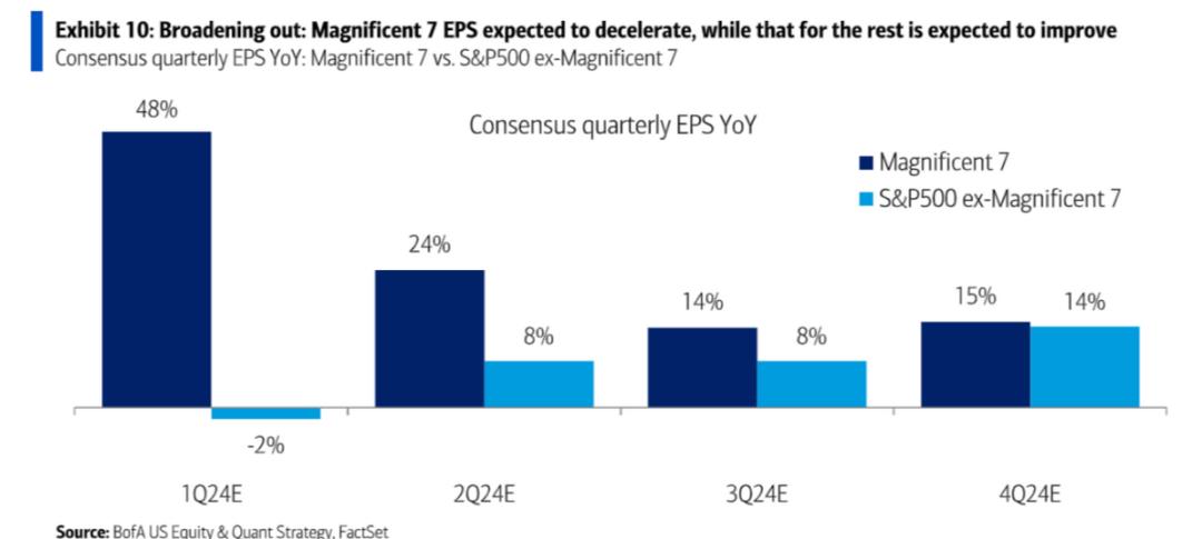 当然,主导去年的美股七神,进入2024年后因进入新投入产出错配周期,EPS增速预期放缓,但标普500整体EPS增速并未放缓,更多是开始被周期性行业补位(比如,内存和中芯国际所代表的传统半导体周期回暖,以及广告行业的小幅加速增长等。)