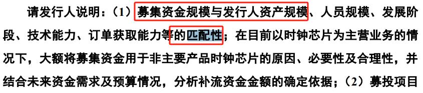 上交所要求说明募集资金规模与公司资产规模、人员规模、发展阶段、技术能力、订单获取能力等的匹配性;在目前以时钟芯片为主营业务的情况下,大额将募集资金用于非主要产品时钟芯片的原因、必要性及合理性,并结合未来资金需求及预算情况,分析补流资金金额的确定依据。