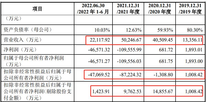 报告期内,公司净利润分别为1893万元、681.75万元、-10.96亿元和-4.66亿元,截至2022年6月30日累计未弥补亏损为-13.71亿元。公司称,主要原因是2020年实施了股权激励,分期确认了高额的股份支付费用,报告期内公司扣除非经常性损益后净利润(剔除股份支付金额)分别为1008.42万元、1.49亿元、9762.53万元和1423.91万元,波动较大。