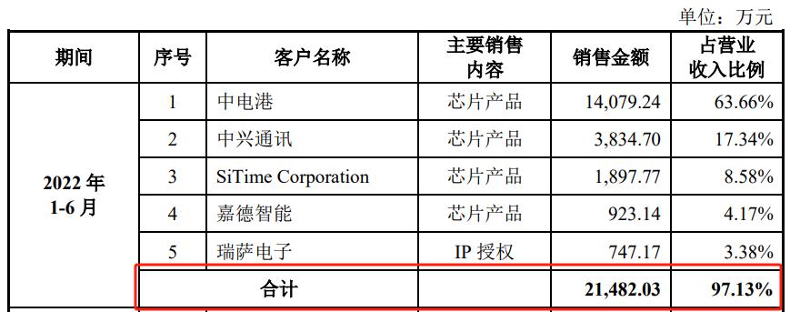 具体看,2019年、2020年、2021年和2022年1-6月,公司对前五大客户销售收入合计占当期营业收入的比例分别为96.55%、98.93%、98.01%和97.13%,其中来自第一大客户的收入占营业收入的比例分别为85%、92.26%、84.41%和63.66%。