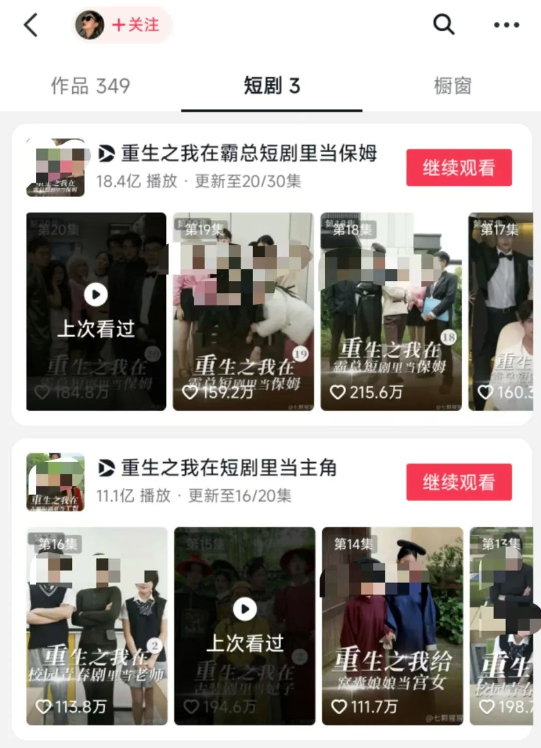 尤其是今年 3 月份开始,她上线了《 重生之我在爽文短剧里当保姆》、《重生之我在短剧里当主角》等系列短剧。
