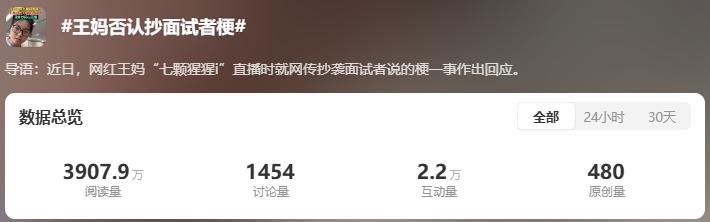 至于网传的 “ 王妈 ” 剧情抄袭面试者的梗, “ 王妈 ” 本人也直播回应了,表示 “ 不用自证,不要听信谣言,没有抄,问心无愧 ” 。