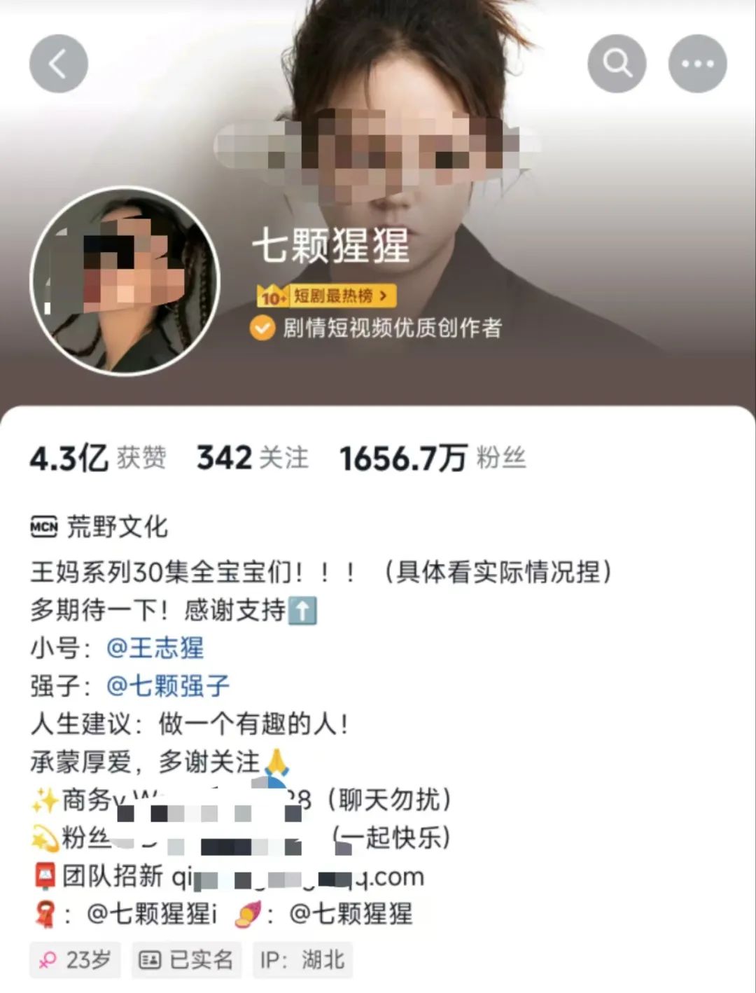 靠着王妈系列短剧更新, “ 七颗猩猩 ” 这个账号短时间内也实现了涨粉百万。