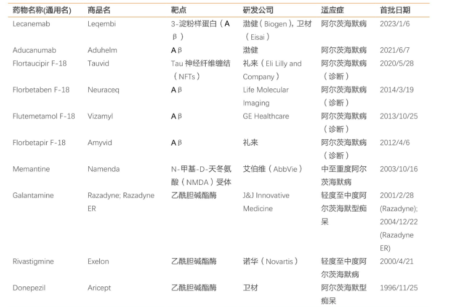 在2021年之前,FDA仅批准过6种治疗AD的药物,包括:他克林(Tacrine)、多奈哌齐(Donepezil)、卡巴拉汀(Revastigmine)、加兰他敏(Galantamine)、美金刚(Menantine)以及美金刚/多奈哌齐复方制剂。