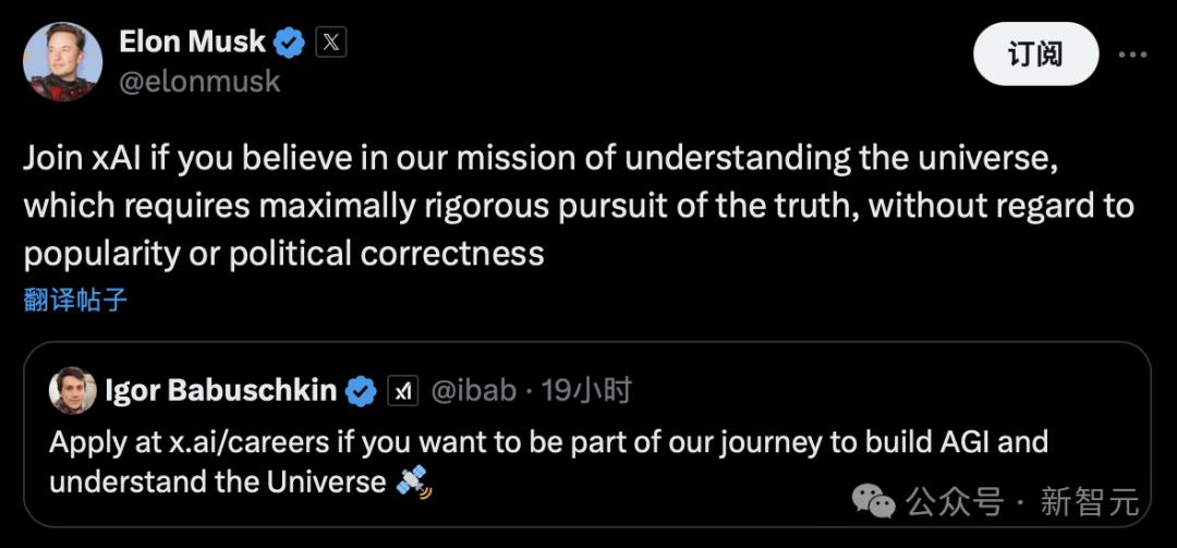 如果你相信我们理解宇宙的使命,就加入Xai吧!这需要在追求真理道路上必须秉持最大的严谨,而不受流行去世或政治正确性的影响。