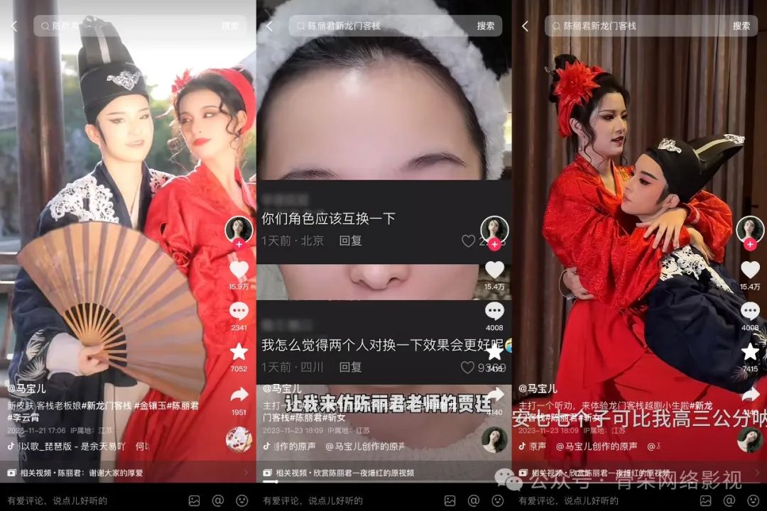 最常见的是许多账号将相关视频剪辑成了正片和花絮,正片是指一比一还原“陈丽君抱李云霄转圈圈”或“陈丽君邪魅一笑”的视频,花絮则是将拍摄过程中有趣的事情进行剪辑发布。而有些被群嘲的账号直接利用评论区的建议,对妆造、拍摄、表演方式进行了调整,从而吸引了新一轮热度。