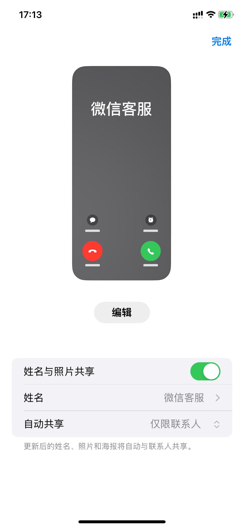 另一方面,FaceTime可以自定义名字和头像,营造出类似于官方客服给你打电话的错觉。比如小雷就在自己的iPhone上尝试着将名字修改为“微信客服”,后续如果我给别人拨打FaceTime,那么对方手机就会直接显示“微信客服”的字样。