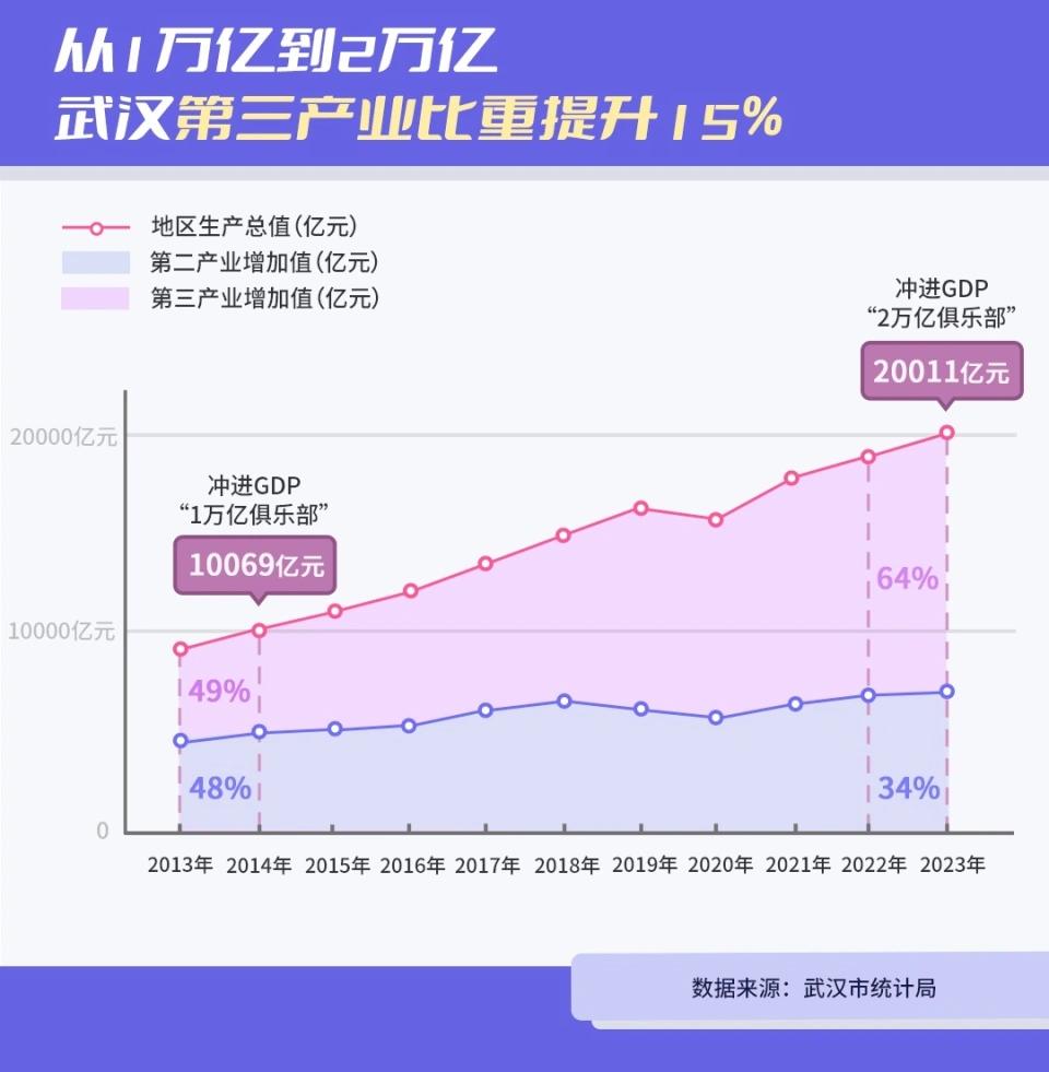 与此同时,武汉也在大力发展第三产业,从2014年三产增加值4933亿,占GDP比重的49%,发展到如今的1.27万亿,占GDP比重的63.6%。