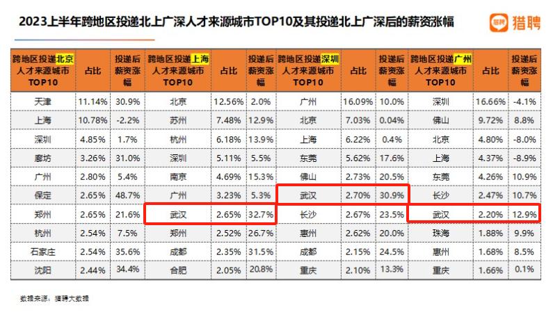 猎聘大数据显示,2023上半年,跨地区投递上海、深圳、广州的城市人才里,武汉人才流向沪深广的薪资涨幅,都是最高的。