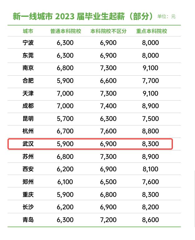 薪智市场人才数据分析平台发布的《2023毕业生薪酬报告(本科生版)》指出,新一线城市里,武汉的2023届普通本科毕业生起薪仅为5900元,在15个城市里排名倒数第二,仅仅比昆明高上200元。