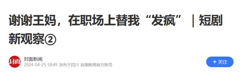 以至于有媒体专门写了一篇短剧观察,名为《谢谢王妈,在职场上替我发疯》的文章,一语道破其提供的最大情绪价值。