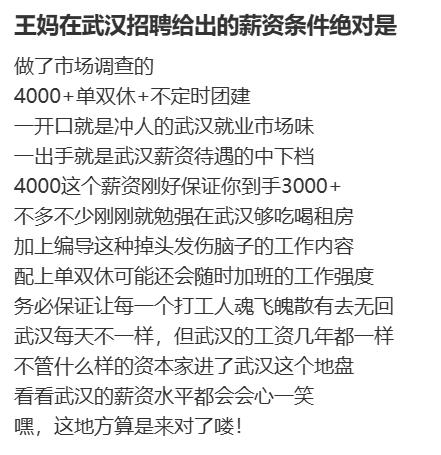 类似的言论俯仰皆是,还有人将其老道地总结为“冲人的武汉就业市场味”——不管是4000的薪资,大小周,还是不定时团建,都应该是做足了市场调研的结果。