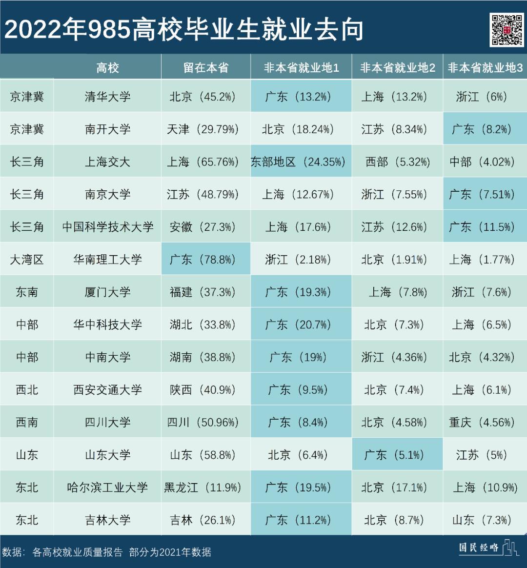 作为鲜明对比的是,位于广州的中山大学、华南理工大学的毕业生,超过七成最终选择留在广东省内就业,而留在广州、深圳两地的就有六成之多。