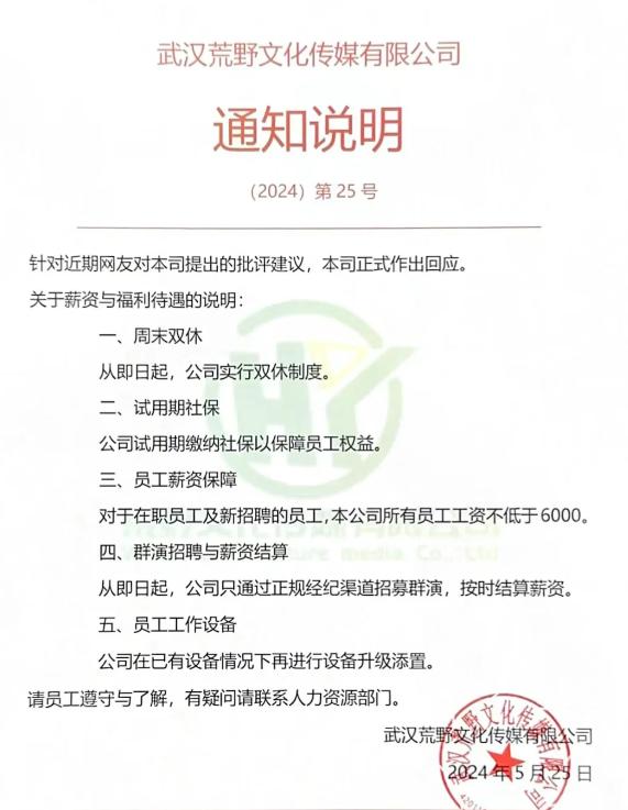落实双休制度,试用期员工也交社保,所有员工薪资不低于6000元,群演也发钱(之前没发),员工不必自带电脑打工……