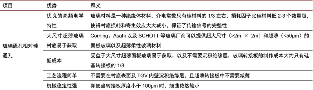 对于2.5D/3D封装,玻璃通孔相对于硅通孔优势更显著。这是因为硅是一种半导体材料,TSV周围的载流子在电场或磁场作用下可自由移动,对邻近的电路或信号产生影响,进而影响芯片性能。玻璃材料没有自由移动电荷,介电性能优良,CTE(热膨胀系数)与硅接近,以玻璃替代硅材料的玻璃通孔(TGV)技术可避免TSV的问题。同时,TGV技术无需制作绝缘层,降低了工艺复杂度和加工成本。