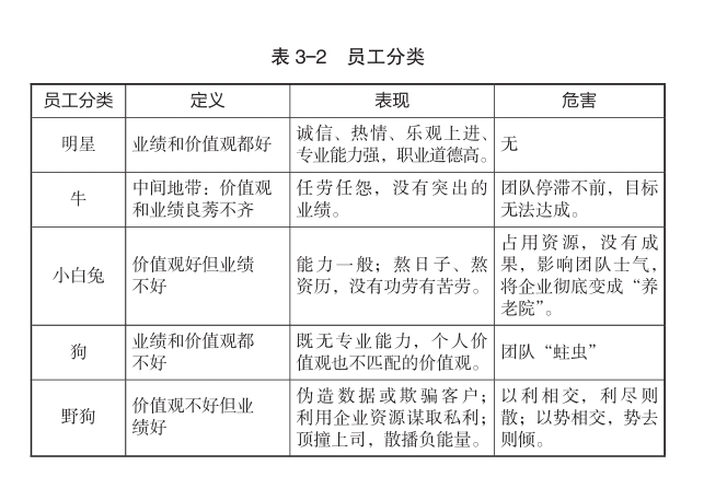 管理者要具备一双慧眼,对员工进行区分。双轨制绩效考核就是管理者对员工进行区分的最佳工具之一。管理者要通过这一考核工具,把团队里各个类型的员工区分出来。员工分类阿里巴巴把员工分为五大类,即“野狗”“狗”“小白兔”“明星”“牛”,如表3—2所示。