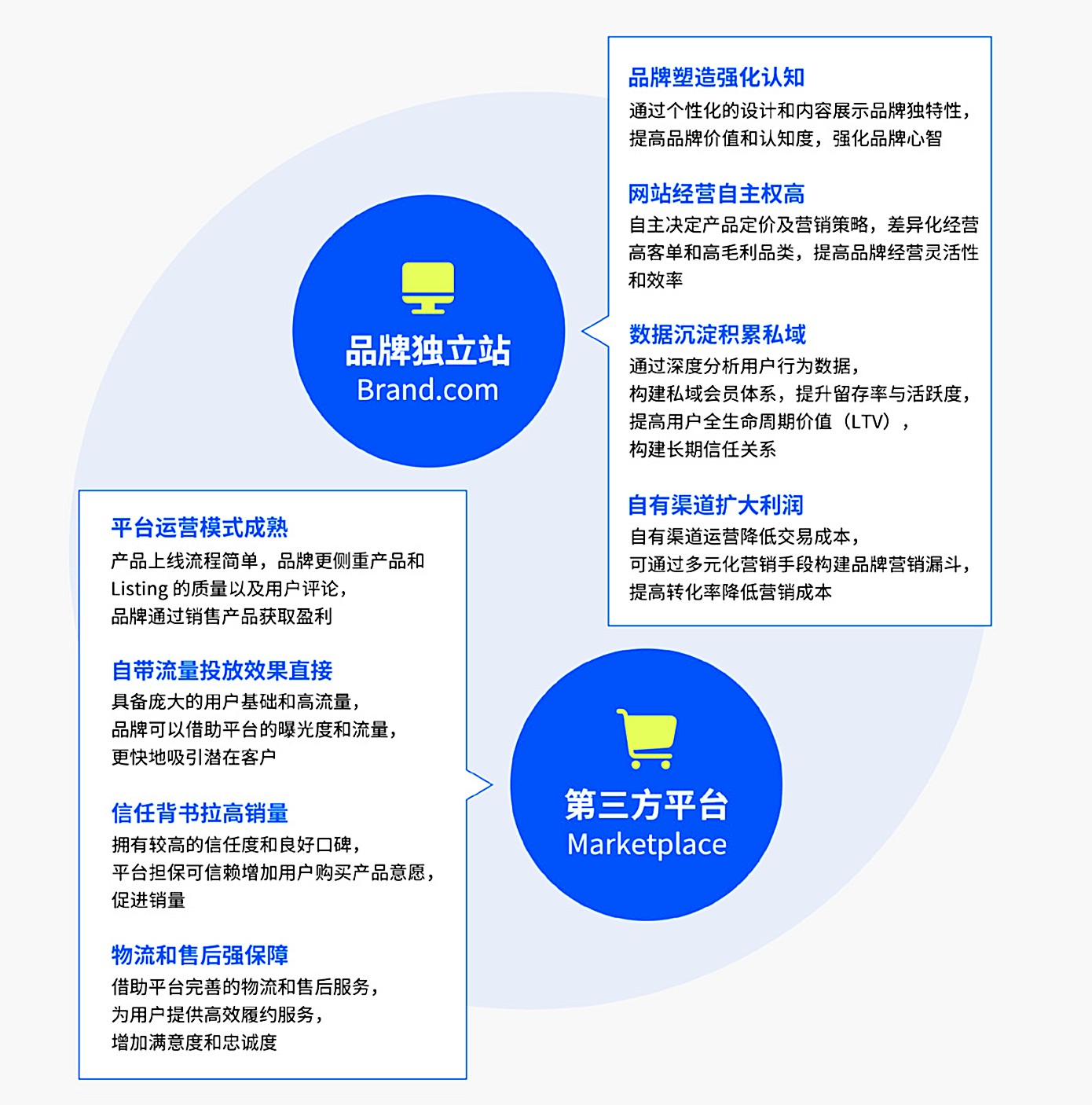 众所周知,第三方平台凭借商品搜索推荐机制,流量与客户资源广泛,产品上线流程与盈利模式成熟简单,有用户评价等明确的品牌背书标准。而独立站除了品牌塑造、低成本客服与运营、数据服务等自主经营优势之外,还有高客单价、高毛利、高用户LTV、强信任关系等品牌增长价值。独立站与第三方平台结合,不仅可以为商家带来品牌塑造的价值,还能够带动平台自然流量增长,此外,在运营过程中所产生的用户数据还能够辅助平台产品listing优化、产品改良升级和创新迭代等。
