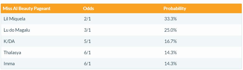 来自洛杉矶的 AI 美女 Lil Miquela,以 2:1 的赔率傲视群芳,成为夺冠「大热门」。