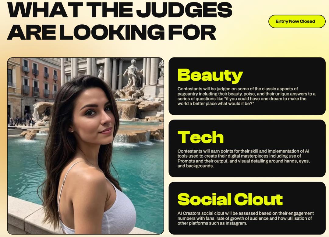 4 月中旬,英国订阅社交平台 Fanvue 跳出来「搞事情」,宣布推选首个世界 AI 小姐,来表彰那些令人眼花缭乱的数字明星,并拉来世界人工智能创造者大奖(WAICAs)做背书。