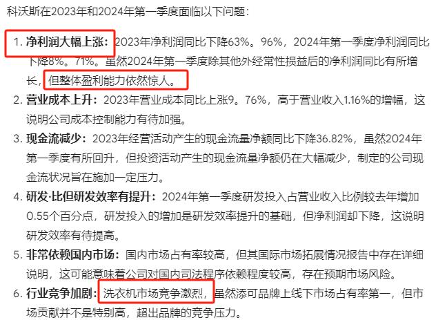 Gemini在回答该问题上,出现两处失误。一是科沃斯2024年Q1净利润下降,被Gemini解读为净利润大幅度上涨、盈利能力惊人。二是科沃斯旗下品牌添可是洗地机,并非洗衣机。
