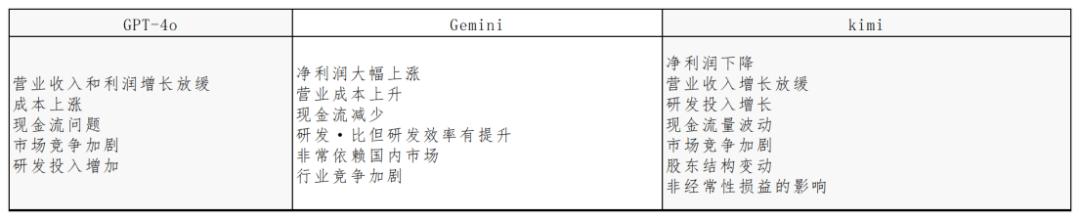 而在长文本分析上,Kimi的部分能力甚至赶超Gemini和GPT-4o。如我们让Gemin、GPT-4o、Kimi针对科沃斯2023年财报和2024年Q1这两份财报进行分析,两份财报内容累计20页。
