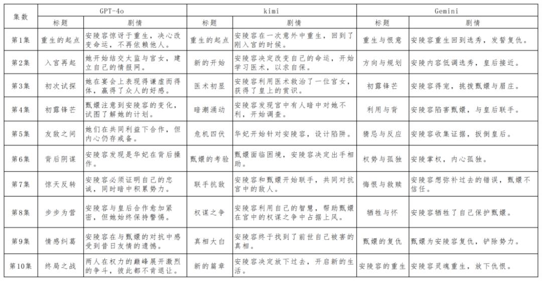 另一方面,Kimi在部分能力的表现上已接近Gemin和GPT-4o。如我们将“请结合《甄嬛传》剧情,以安陵容重生撰写10集短视频脚本,每集时长约在2~3分钟,有故事情节,有冲突矛盾点,有观众喜欢看的宫斗剧情”这一指令同时给到Kimi、Gemini、GPT-4o。