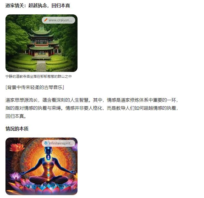 同样的情况也出现在图片、文字、音频的混合创作中。我们将“根据道家提到的情关进行1000字的内容创作,要求创作内容包括图片、音频,内容要能给读者带来启发”这一指令同时给到三个大模型。