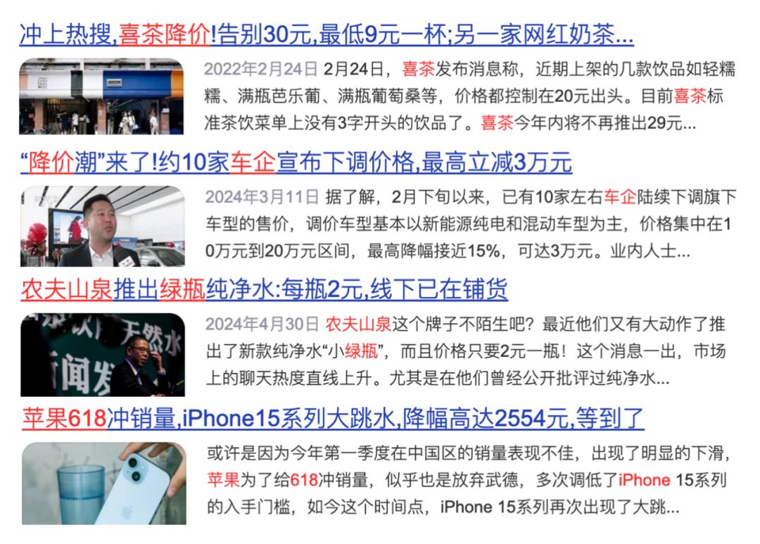 喜茶降价了;各路车企降价了;农夫山泉也顺势推出绿瓶纯净水,变相降价了。就连一贯“高冷傲娇”的苹果手机,也意外地放下身段,在618期间大幅降价促销。