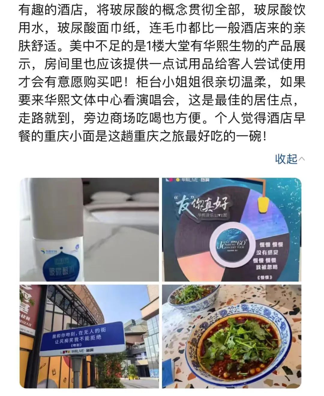 根据已经入住过的网友评价分享,这家酒店确实是将玻尿酸的概念贯彻全部,玻尿酸饮用水、玻尿酸面巾纸,甚至在一楼大厅还有华熙生物产品展示。不过也有网友认为这样的主题属实有点“魔幻”,不知道初衷是什么,又有多少人会因为玻尿酸主题而选择这家酒店。