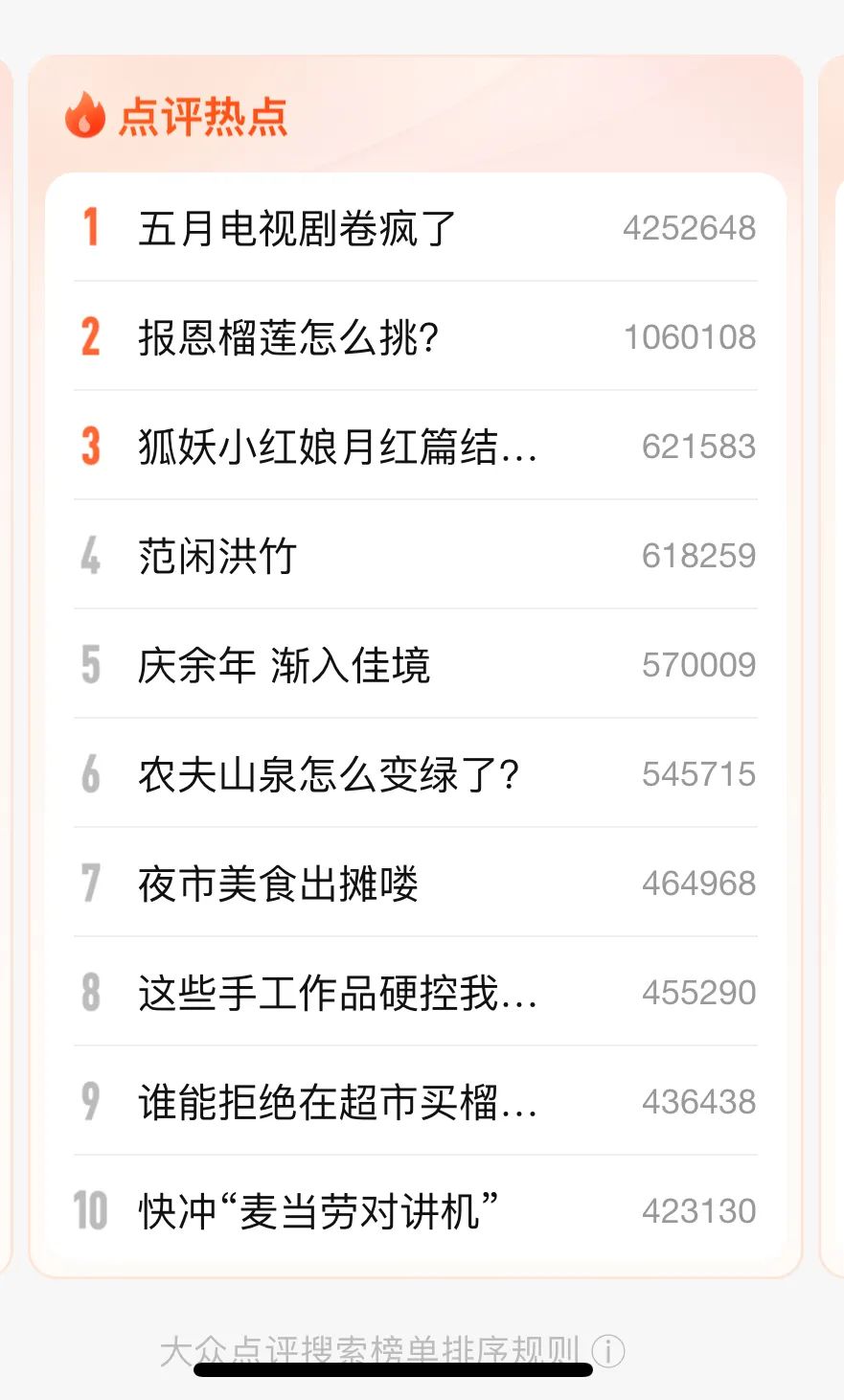 本周,大众点评的搜索热点排名中,第一位是“五月电视剧卷疯了”,排在热榜前五名的除了“榴莲怎么挑”是关于美食的话题,“狐妖小红娘”“范闲洪竹”“庆余年渐入佳境”都是当下热播剧的相关内容。