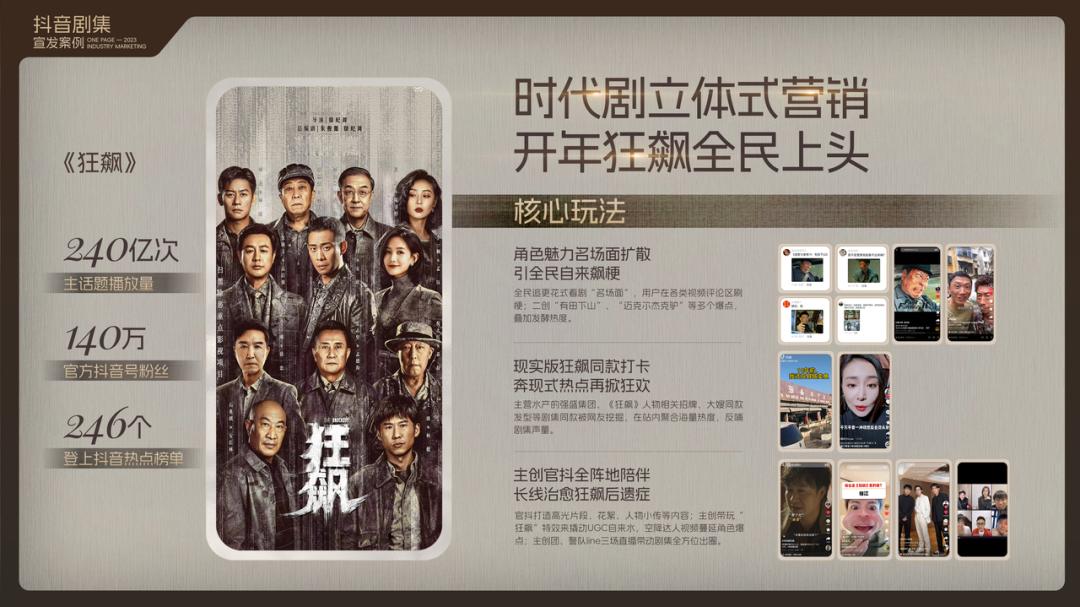 为了让主创和观众及时沟通交流,剧方“官抖”打造了高光片段、花絮、人物小传等短视频内容;主创带网友一起玩“狂飙”特效,撬动UGC自来水,空降达人视频蔓延角色爆点;主创团、警队line三场直播带动剧集全方位出圈。最终形成官抖全阵地陪伴,长线。