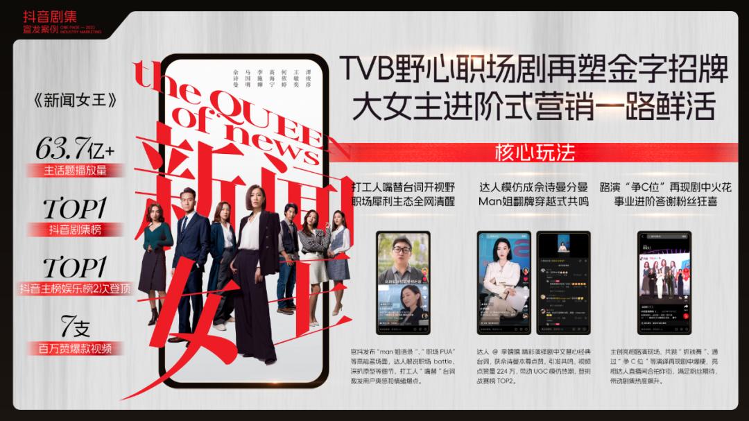 优酷的热播剧《新闻女王》,也能看到抖音叠加营销的效果。剧集播放期间,主话题播放量63.7亿次,成功登上抖音剧集榜TOP1,娱乐榜登顶2次,成就7支百万点赞的爆款短视频。官抖发布的“man姐语录”、“职场PUA”等高能名场面,达人解说职场battle、深扒原型等细节,打工人“嘴替”台词,皆起到激发用户爽感和情绪爆点的作用,为剧集出圈助一臂之力。