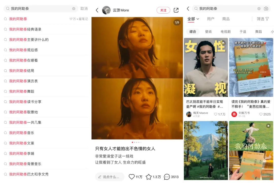 爱奇艺出品的《我的阿勒泰》热播期间,文娱价值官在小红书看到,达人发布关于阿勒泰相关的图文、视频笔记17万+,搜索“我的阿勒泰”会出现16个相关目录,一篇名为“只有女人才能拍出不色情的女人”是关于《我的阿勒泰》浴池戏份分析的笔记,点赞超11万,收藏1.3万,评论3万+。