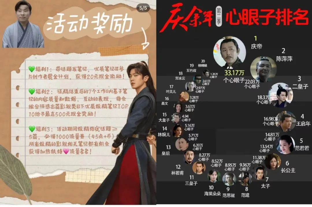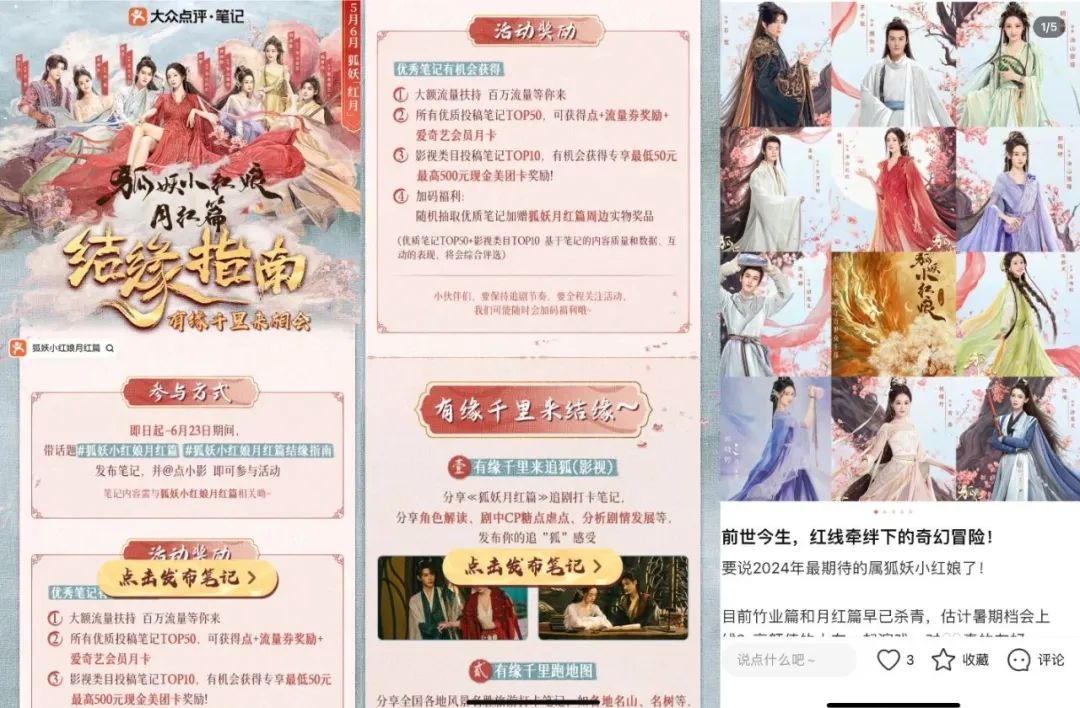另一部正在爱奇艺热播的《狐妖小红娘-月红篇》也频繁出现在大众点评的笔记中。文娱价值官看到,在带剧集相关话题的视频或图文笔记里,TOP50的笔记有机会获得50——500元奖金,并有爱奇艺月卡和流量扶持政策等激励。