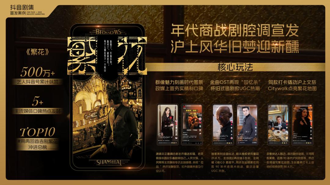 同步发起晒繁花同款90年代老照片挑战,撬动海量UGC共创。抖音还联动多垂类达人探访剧中泡饭、牛河同款美食,还原90年代沪风妆容等,带动全网谱写繁花地图。主创董勇打卡上海地标视频获赞88.4万。