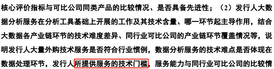 为此,公司被问大数据分析服务在分析工具基础上开展的工作及其技术含量、哪一环节起主导作用,结合大数据各产业链环节的技术难度差异、同行业可比公司的产业链环节覆盖情况等,说明大量外购技术服务是否符合行业惯例,数据分析服务的技术难点是否体现在数据处理环节,公司所提供服务的技术门槛,服务能力与同行业可比公司的比较情况、是否具备先进性。