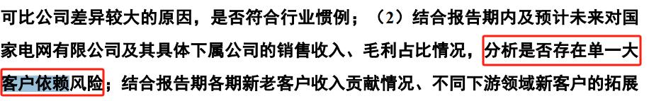 公司客户高度集中,其中对国家电网及其下属公司各期营业收入占比均在55%以上,上交所关注是否存在单一大客户依赖风险。公司另一主要客户南方电网,持有公司4.62%股份,监管关注双方是否存在其他特殊约定或利益安排,相关采购是否具有持续性。