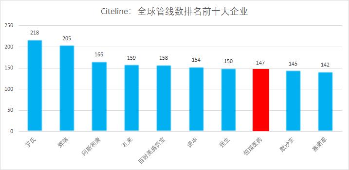 国内临床研究管线最多的,正是恒瑞医药,是百济神州的两倍有余。哪怕是放在全球竞争格局中,恒瑞也跻身全球管线数TOP10药企之列。