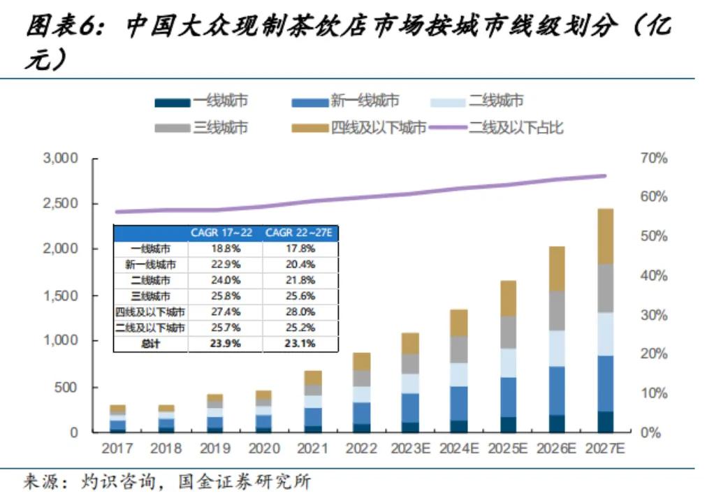 据灼识咨询数据,2017年至2022年,三线及以下城市市场复合年增长率达30.2%,从2017年的196亿元扩大至2022年的732亿元。2023年,三线及以下城市市场增速预计达31.4%,未来两年增速仍将保持在20%以上。