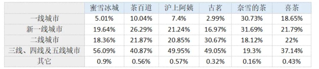 根据蜜雪冰城招股书,截至2023年9月,其门店总数达到3.6万家。其中,三线及以下城市有1.8万家店,占全国总数的56.9%。作为对比,同期沪上阿姨的门店数占比为49%,茶百道的比例还要更低。