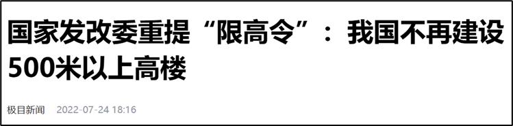 直到2022年7月,国家发改委再次严格强调“限高令”要求,彻底断了新建500米以上的建筑的可能性,才为狂热的摩天高楼建造真正泼了盆凉水 。