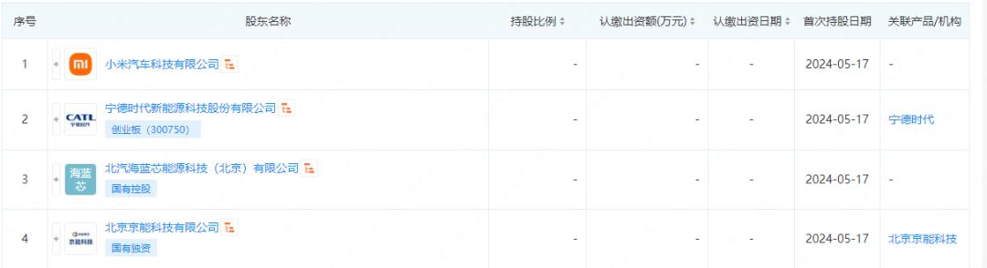 除了宁德时代、小米两个主体之外,北汽海蓝芯能源科技(北京)有限公司是由北汽集团产业投资有限公司持股;北京京能科技有限公司则是世界银行/全球环境基金(GEF)与原国家经贸委联合发起的“中国节能促进项目“所设立并支持的第一批三家节能服务示范公司之一,是京能集团全资控股二级公司。
